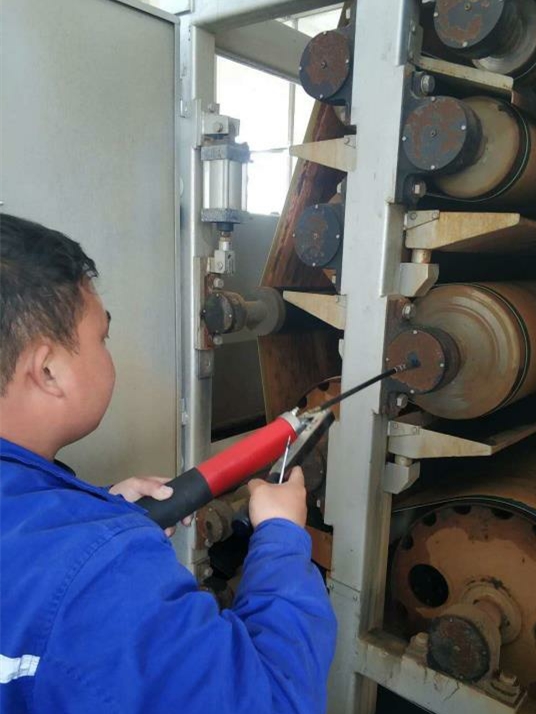 ͼ/ É豸ÖÎÀíÈËÔ±ºØÏþ¶«ÕýÔÚ¸øÎÛÄàÍÑË®É豸¼Ó×¢Èó»¬Ö¬